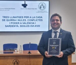 Recientemente ha defendido su tesis doctoral en la Universitat de València, ante un tribunal conformado por investigadores y docentes de las universidades de Alacant, Barcelona y Autónoma de Madrid, el profesor y cronista de Llombai, Vicente Sanz Viñuelas. Su trabajo, titulado Tres llinatges per a la Casa de Quirra i Nules. Conflictes i poder a València i Sardenya. Segles XVI-XVIII, que mereció el elogio unánime del tribunal fue calificado con Sobresaliente con mención Cum Laude y de Especial Relevancia. La investigación estudia la trayectoria de tres linajes: los Carròs de Centelles, los Borja y los Català de Valeriola que fueron importantes protagonistas y testigos de distintos episodios y cambios que tuvieron lugar en su época.