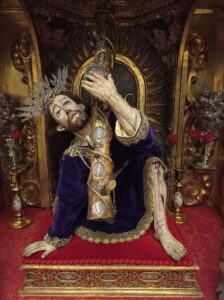 El pasado 15 de noviembre se acaban de cumplir 350 años de la llegada a nuestra ciudad del «Divino Indiano». Tal día como aquel, un comerciante vecino de Cádiz, cargador a Indias y benefactor del convento-monasterio de Jesús Nazareno, Julián Cortés, firmaba con las Madres Agustinas Recoletas, ante la madre Antonia de Jesús y toda la congregación reunidas en capitulo, la entrega de una talla –imagen y hechura– de un Nazareno arrodillado con la cruz a cuesta traído de Nueva España –México–, para convertirlo en su patrono. La talla está realizada en madera de quiote, tallo floral de maguey o pita, policromada y sellada con cera de Campeche. Representa a«Jesús Nazareno de la caída».