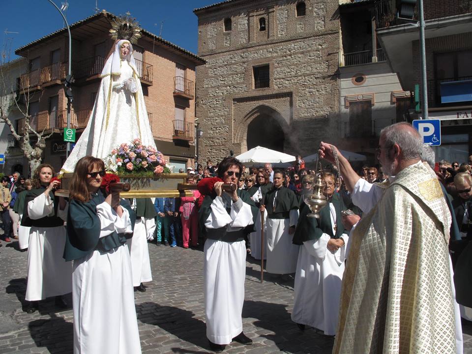 A la mañana siguiente, la Procesión del Resucitado o “del Encuentro”, dos procesiones que se funden en una. El Cristo Resucitado del escultor Vicente Cid, salió de la iglesia-museo de El Salvador y la “Virgen del Encuentro” desde la iglesia de Santa María la Mayor, ambos con dirección a la Plaza del Arrabal, donde con el ceremonial acostumbrado se encontraron ambas imágenes, la Madre con su hijo Cristo Resucitado, rodeadas de cofrades de hábito blanco y esclavina de verde oliva, y el numeroso público allí congregado. Gestos de reverencias, incienso, campanillas y redobles, para dirigirse con ambas imágenes a la parroquial de Santo Domingo de Silos donde se celebró la solemnidad de la Eucaristía de la Pascua de Resurrección.