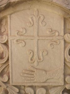 Una de las dificultades que siempre presentan las piedras armeras es conocer sus esmaltes o colores. En esta ocasión no ofrece ninguna duda que su campo es de plata (color blanco, como los mantos de los caballeros de la Orden de Calatrava), mano al natural (ya que los cuerpos se suelen pintar en color carne) surmontada (teniendo encima) de cruz de gules flordelisada (cruz roja cuyas puntas terminan en flor de lis) que corresponde a la de la Orden de Calatrava.