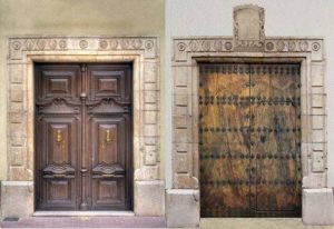 Puerta de la casa realizada por el célebre maestro ebanista sajeño Pedro Estevan Alpañés y aspecto que pudo tener con el escudo | Rubén Navarro.