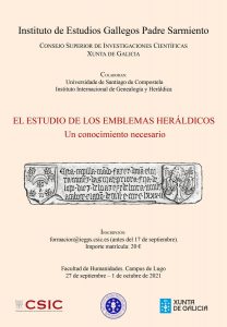 El Instituto de Estudios Gallegos Padre Sarmiento, junto con la Universidad de Santiago de Compostela y el Instituto Internacional de Genealogía y Heráldica, ha organizado el curso titulado El estudio de los emblemas heráldicos, un conocimiento necesario, que se desarrollará del 27 de septiembre al 1 de octubre de 2021 próximos.