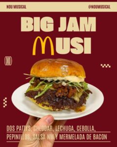 Estamos ante una cocina diferente: “BIG JAM MUSI”: DOS PATTYS, CHEDDAR, LECHUGA, CEBOLLA, PEPINILLOS, SALSA NM Y MERMELADA DE BACON.