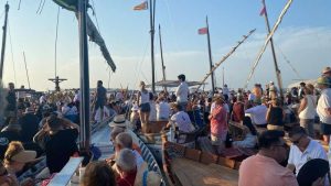 Bajo los acordes de la banda de música el Santísimo Cristo ha recorrido las calles del Palmar hasta llegar al embarcadero y acompañado de más de doscientas barcas se ha adentrado en el lago de la Albufera. Ya en el centro D.Antonio Teruel, el sacerdote, ha dedicado unas cumplidas palabras a todos los asistentes y finalmente ha bendecido las aguas cantando los gozos el coro parroquial y estando muy cerca de la barca que porta al Cristo, sus Clavarios y Clavariesas, y las hijas de María.