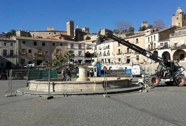 El primer paso ha sido acordonar la zona y la retirada de las distintas piezas, una a una, por los operarios. Fuentes municipales recuerdan que esa estructura fue colocada en 2005, con la reforma que se hizo de la plaza Mayor. Contaba con unos pequeños caños para salir agua, aunque no funcionaban desde hacía años. Martín explica que la intención ahora es poner una fuente parecida a la que se puso en su momento para conmemorar la llegada del agua a la ciudad, el 31 de mayo de 1899. «Queremos volver a lo original», señala. Antes de colocar esa nueva fuente, es necesario recuperar ese pilar granítico, puesto que sufre filtraciones. Para ello, el edil pone de manifiesto que se tendrá que hacer un trabajo minucioso, picando las juntas y retomándolas para, seguidamente, impermeabilizarlo. Hecha esa labor, se volverá a llenar de agua de forma permanente.