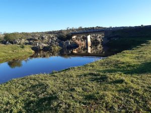 Hoy vamos a tratar del puente que cruza el Arroyo de Talaván y que es la línea divisoria entre los pueblos hermanos de Hinojal y Santiago del Campo, a la altura del punto kilométrico 10, entre los parajes conocidos como la Cuestafría y Las Pizarrosas. Este tramo de carretera se da en una zona de la penillanura cacereña, con mucha vegetación de monte bajo.