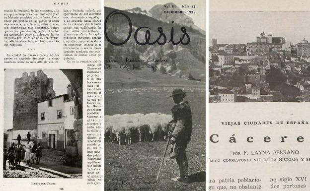 También heredé del compañero varias cajas con revistas viejas. Una de estas noches estuve enredando en una de las cajas, y vi un ejemplar de la revista Oasis, de diciembre de 1935, que me llamó la atención porque contenía un amplio reportaje de 11 páginas sobre Cáceres que firmaba el historiador F. Layna Serrano.