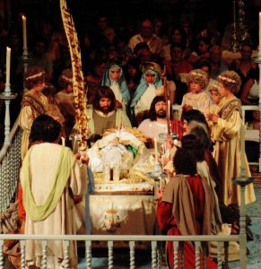 Tras la comida, pudimos asistir a la Procesión de la Virgen, presidida por el Ministro, Clero y Autoridades, y a continuación pudimos disfrutar de nuevo con la segunda parte de la representación. Todo fue majestuoso. Como suele decirse me quedaba con la boca abierta viendo cosas tan bonitas, que como digo no supe entonces valorar, ya que la idea central era, que la Virgen subía a los Cielos. Pero ya lo máximo fue cuando se abre el Cielo y empieza a bajar en un artilugio, con niños de verdad. Cuando los ví, pensé en el miedo que habría tenido yo. Impresionante cuando se abre y despliega sus alas, en forma de palmera, todos los ojos estaban pendientes de sus cánticos celestiales, muy fino en su sonido, sin saber los que decían. Pero en esos momentos era todo tan bonito, que mirabas el conjunto de la escena y estabas maravillado de haber podido asistir a tan importante acto.