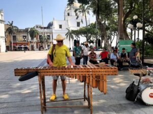 En el zócalo de Veracruz, con la marimba de Los Lupita, detrás de mí; más atrás la catedral. Una marimba de encino con teclas de palo de rosa. Los «puestos» de la marimba se llaman pícolo, tiple, centro armónico y bajo, y en ésta de la foto, tocan a la vez dos marimberos. Además de la marimba y la voz, Los Lupita acompañan sus sones con pandero jarocho, quijadas de burro, jarana, requinto, batería, violón, contrabajo…