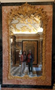 Con Raquel Díaz Rámila en la Sala de los Espejos del Palacio de Felipe V, de Filippo Juvarra, en La Granja de San Ildefonso, Segovia. No es la Galerie des Glaces, de Versalles, que concibió Jules Hardouin Mansart para Luis XIV; tampoco el Gran Salón Dorado, de Bartolomeo Rastrelli, del Palacio de Catalina en Pushkin, cerca de San Petersburgo; ni la Sala degli Specchi, de Ignazio Perricci, bajo supervisión de la Princesa Margarita, en el Palazzo del Quirinale, en Roma; ni la del Palacio Real de Aranjuez, de Giovanni Battista Galluzzi y Giacomo Bonavia, para María Luisa de Parma; ni la del Casino Español, de Veracruz, homenaje a Carlota y Maximiliano. Espejos todos que reflejan, eso sí, la gloria del ocaso.