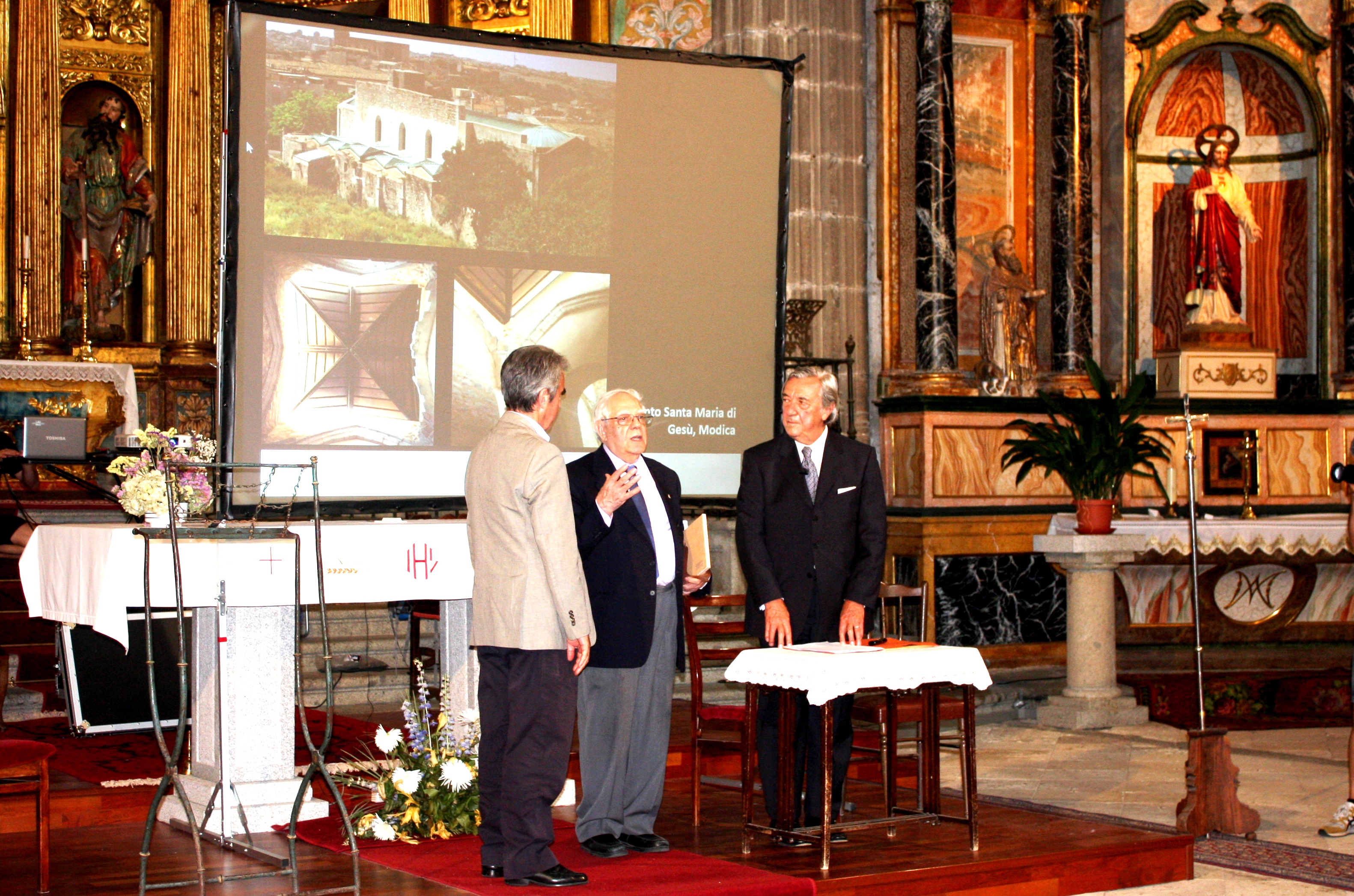 Pronunció D. Giuseppe la “Lectio Magistralis”, ayudado por la proyección sobre una pantalla de sendas fotografías de diferentes tipos de restauraciones en monumentos artísticos.