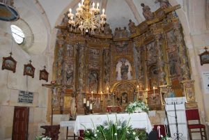 El retablo es de estilo barroco prechurrigueresco del siglo XVII, y su estado es pésimo, con riesgo de desprendimiento por desplomes y desajustes estructurales de los ensamblajes. Se empezó a construir en 1684 por el maestro José Rodríguez y su coste ascendió a más de 7600 reales. Las esculturas fueron ejecutadas por el maestro burgalés Ventura Fernández desde 1685. Las tareas de dorado fueron hechas por Toribio García Gutiérrez y Lucas de la Concha desde 1690.