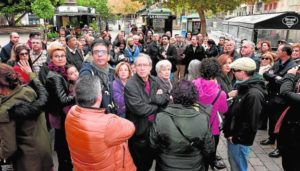 A través de históricas calles, el grupo llegó a la plaza de Santa Catalina, la antigua y renombrada plaza de Chacón, con la escultura en homenaje a los artistas murcianos y su sorprendente recuperación. La siguiente parada se centró en la plaza de Santa Catalina. Allí hubo soportales, la Torre del Reloj que marcaba el pulso de la ciudad, derribada por un terremoto; la Real Carnicería o mercado de la carne; el llamado Contraste de la Seda, en cuyo lugar se construyo en 1933 el monumental edificio de La Unión y El Fénix -su escultura corona hoy, sobre la cúpula, este espacio que en otra de sus esquinas tiene el Museo Ramón Gaya-; y la campana del toque de queda.