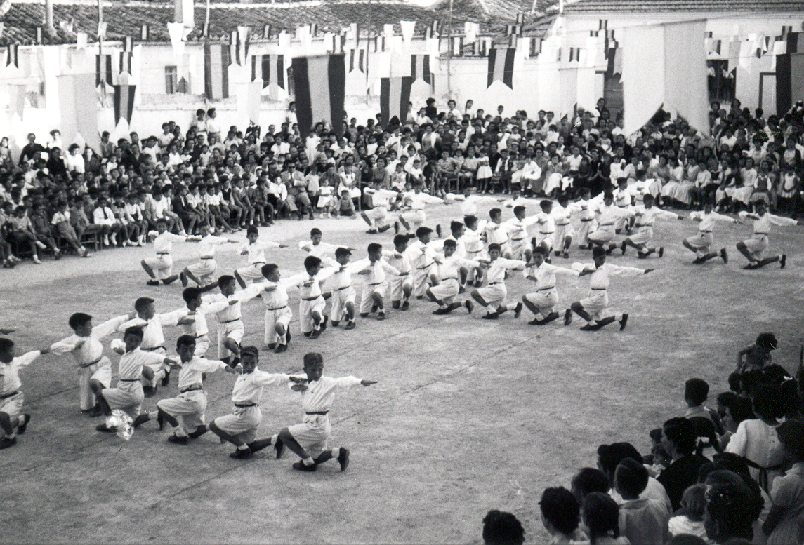 Por la mañana Luis, el jardinero, regaba el patio de juego varias veces para evitar que se levantara la habitual polvareda. Todo el recinto estaba engalanado con banderas que ponían una nota de color festivo en el ambiente. En la parte superior del patio se colocaba un gran escenario donde tenían lugar las actuaciones, que con tanta ilusión habíamos preparado las últimas semanas. Frente a la entrada se colocaba la tribuna, presidida por los sacerdotes del Centro, las autoridades locales y el médico, que nos permitía “comer de todo”, D. Gabriel Tera. Al fondo se colocaban nuestras familias y el centro del recinto quedaba libre para las demostraciones deportivas y de entretenimiento.