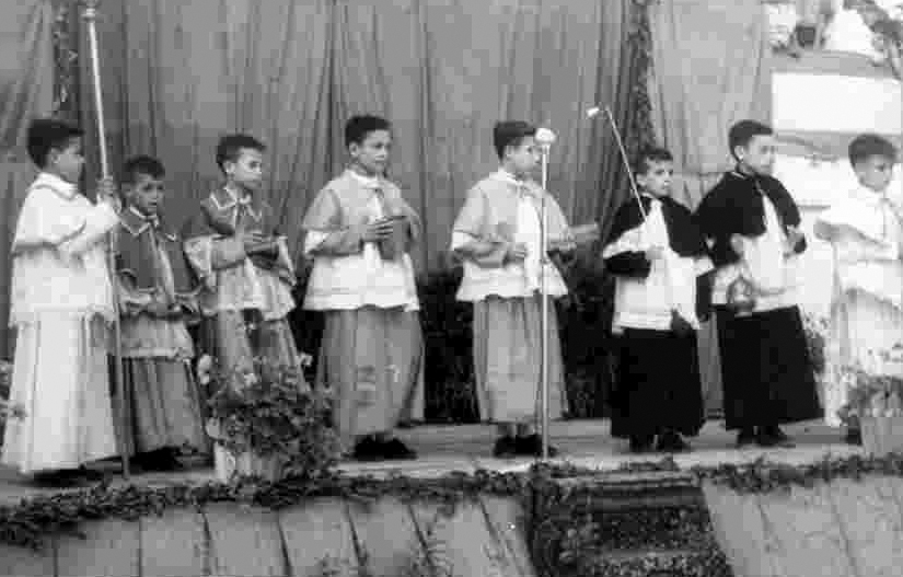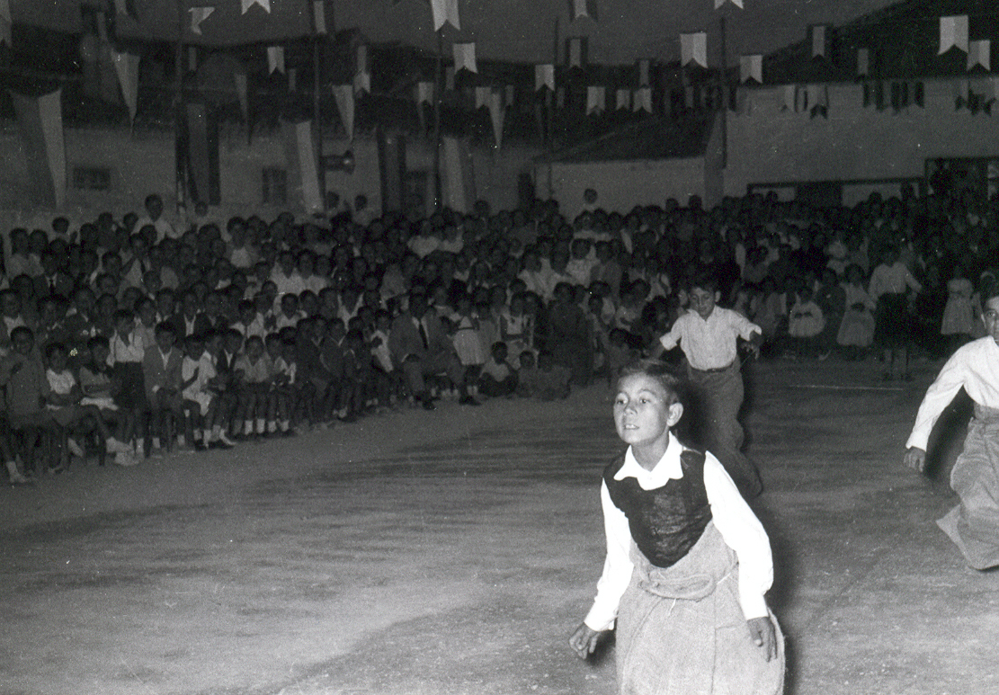 “El patio de recreo se encuentra con colgaduras nacionales y de la institución. En el escenario los micrófonos de Radio Villanueva. Asiste la banda municipal de música. Cerca de dos mil personas entre mayores y niños. Junto al Padre Pérez, el Párroco D.