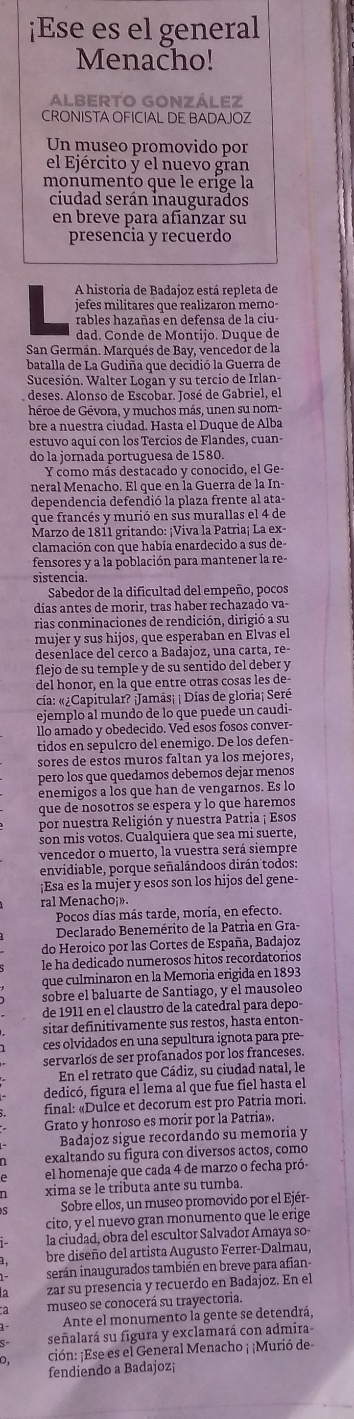 Ante el monumento la gente se detendrá, señalará su figura y exclamará con admiración: ¡Ese es el General Menacho! ¡Murió defendiendo a Badajoz!