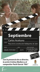 «Septiembre» se proyectará el sábado 27, a las 22:15 horas, en la plaza de la Constitución de Valdepeñas de Jaén, coudad dónde se rodó integramente la pelicula, contará con la asistencia del director Carlos Aceituno,, la actriz protagonista Cristina Mediero y el compositor de la banda sonora Pachi Garcia, el cual tocará en directo varios temas de la película.