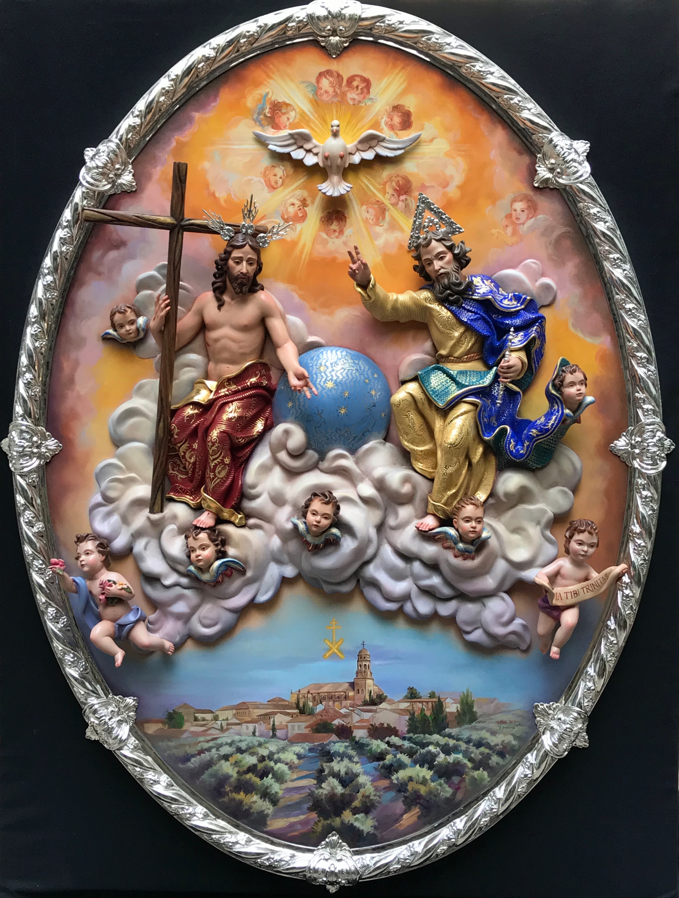 Ha finalizado “La Gloria” del techo del palio para la Cofradía “El Rescate” de Baeza, que dio vida y expresividad a la Virgen de la Trinidad, con un resultado gratificante y embellecedor. Talla en madera de cedro policromada, estofada y cincelada. 100 x 72 cm.