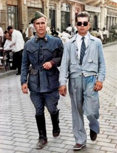 Feliz día del padre. Esta mañana, en mi visita al cementerio, quería recordarte cuando eras joven, tan joven que yo ni siquiera había nacido. Y esta foto me dice mucho de esa historia, paseando en 1950 (tenías 23 años) por la avenida con un pariente (el tópico soldado que venía a hacer la mili), con tu fuerte personalidad y esa clase y saber estar que todavía hoy te envidio. Al fondo la «Casa Tortosa», porque vivimos nuestras vidas en el mismo espacio, en la misma Melilla, aunque en tiempos diferentes. Feliz Día del Padre, cada día con más recuerdos y más nostalgia.