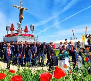 El día tres de mayo, el Cristo de la Vera-Cruz, se ha trasladado por anderos,con la cruz de madera, que esculpió Mariano Benlliure, hasta el convento de dominicas de Santa Ana, en donde se ha procedido por las monjas al cambio de faldellín por rogativas, con gran emoción cuando la priora Sor Fuensanta realizaba el cambio y por ser , tal vez la primera vez, que el Patrón visitaba la iglesia. Después. la imagen del Cristo de la Vera-Cruz ha continuado hasta la iglesia de San Andrés, en donde lo ha recibido la Virgen de la Encarnación, y se ha trasladado al trono. Tras la celebración de la Eucaristía, se inició la procesión hasta las Eras del Calvario y realizar la antiquísima bendición de los campos, en una mañana soleada, en la que la bajo el dosel de un cielo azul, y un sol radiante, en el que los verdes campos y las rojas amapolas, y los mares de olivos, parecen enmarcados en un cuadro, han rendido su homenaje al Cristo de la Vera-Cruz, en esta solemne ceremonia, que ha finalizado con las palabras del párroco D. Juan Carlos Córdoba, Posteriormente se ha iniciado la procesión de regreso a su iglesia. Hay que destacar el acompañamiento de la mujer villanovense con la elegancia de la mantilla,; autoridades locales y representantes de las distintas Cofradías de Pasión y Gloria, las notas musicales que durante la procesión sonaron por parte de la Banda Agrupación Musical, “Nuestro Padre Jesús Nazareno” y Unión Musical “La Moraleja” y los anderos del Cristo de la Vera-Cruz y anderas de la Virgen de la Encarnación, que con mimo y esfuerzo llevaron sobre sus hombros el fervor de las dos imágenes.