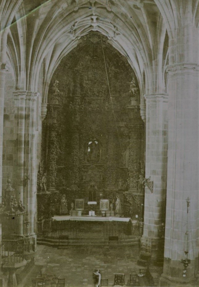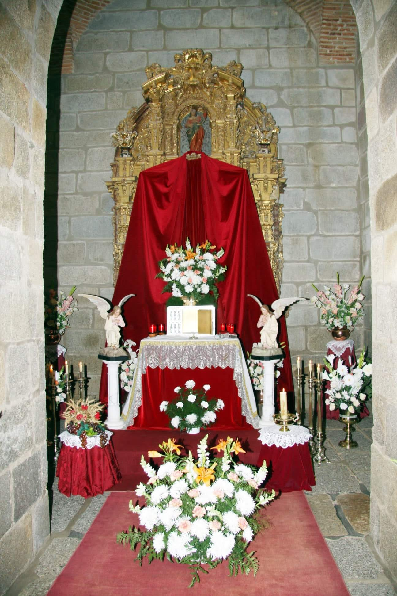 La foto en la que se ve el altar mayor, con el precioso retablo de Bartolomé de Jerez, del siglo XVIII, estaba el ara donde se decía la misa en latín y de espaldas a los fieles. Tras la transformación del altar, después del Concilio Vaticano II, allí había varias imágenes, algunas de las cuales han desaparecido, como santa Bárbara, que tiene una ermita en la calle, Aldehuela, reconvertida en fragua y desde hace años, totalmente cerrada. Parece ser que esta imagen se vio, hace muchos años ya, en una tienda de antigüedades de Cáceres capital. Santa Bárbara estaba colocada en la parte de la Epístola en el altar mayor. También aparece san Joaquín, la imagen situada en la parte del Evangelio que llevaba una Virgen niña en su mano izquierda. Hoy esta imagen está en la capilla del Santísimo, como se puede ver en la foto hecha en el Monumento del Jueves Santo.