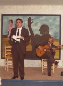 Año 1982. Presentando uno de los festivales, fueron varios, organizados por la Peña Flamenca El Garbancero en su sede. En los tiempos en los que Manuel García Quismundo, gran aficionado al flamenco y encargado de la empresa Hispano Alemana de Construcciones que construyó el segundo silo en la carretera de la Estación, los impulsó y organizó. A los que nunca faltó Manolo Vargas, fotógrafo, guitarrista y mejor persona. (Recuerdo que me hace en el día hoy Facebook).