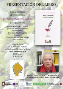 El viernes 20 de febrero, también a las 19:30 horas y en el salón de actos de la Biblioteca Pública, será el turno de Vino y literatura en Extremadura, del profesor y escritor Francisco Gutiérrez Carbajo. En esta presentación intervendrán igualmente José Luis Marín Aranda y el editor Basilio Rodríguez Cañada, en una sesión centrada en el diálogo entre tradición vitivinícola y creación literaria en la región.