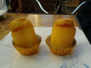 Una vez sacados del horno, enfriados y desmoldados, se colocan en una bandeja y se bañan con un almíbar claro que tenga un leve toque de licor.