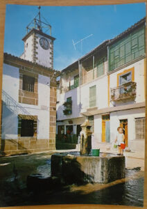 Son muchas las historias que se podrían contar simplemente con observar esta bonita postal con la que iniciamos esta nueva entrada. Historias de la fuente, de la popularmente conocida como «Calzadilla», lugar de encuentro imprescindible del ayer y del hoy, de los animales por las calles -como la gallina que aparece junto a la fuente-, de las solanas de las casas o de la niña que, con dos cubos, está subida en la fuente. Como dice el refrán, una imagen vale más que mil palabras y así queda demostrado en esta postal.