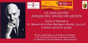 En la tertulia del próximo día 30 de mayo, tendrá lugar un pequeño homenaje a Manuel de la Peña en agradecimiento a su trabajo de investigación y aportaciones históricas y desde la Asociación de Amigos del Museo, se está trabajando para que algún día la obra de Manuel de la Peña (hoy dispersa por muchos lugares e instituciones de Getafe) pueda conservarse y protegerse el Museo. Esta es una aspiración y una pretensión que a la Asociación del Museo le gustaría alcanzar, pues se trata de garantizar su custodia en el Museo y facilitar la lectura de sus libros a aquellos socios y personas interesadas en su obra.