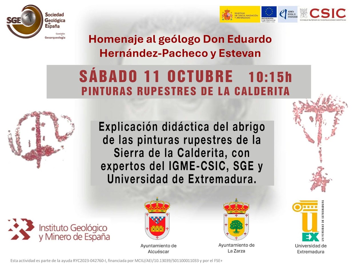 La Comisión de Geoarqueología de la Sociedad Geológica de España (SGE), en colaboración con el Centro Nacional Instituto Geológico de España (IGME-CSIC), los Ayuntamientos de La Zarza (Badajoz) y Alcuéscar (Cáceres), la Universidad de Extremadura y la Universidad de Córdoba, organizan el próximo sábado 11 de octubre de 2025 una jornada de homenaje a Don Eduardo Hernández-Pacheco y Estevan (1872-1965), destacado geólogo, arqueólogo, naturalista y pionero en los estudios de conservación del patrimonio natural y cultural en España.