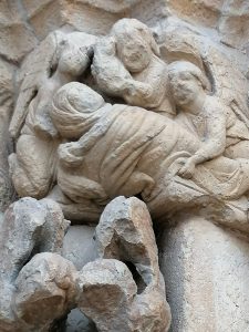 Mi felicitación a todos los Joaquínes y las Anas de la Región de Murcia, a quienes obsequio con esta imagen del parto de Santa Ana a la Virgen, representado en unl capitel de un monasterio románico perdido por tierras de Castilla.