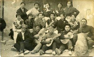 En los años treinta comenzaron a aparecer los disfraces, buscando cierta uniformidad en el atuendo, que solía ser de elaboración personal. En la imagen podemos contemplar un grupo de niños y mayores que lucen pañuelos blancos al cuello, pequeñas chisteras, y las féminas delantales blancos. Los participantes tienen asidas botellas de bebida o tazas. Un chico porta un acordeón y sobre sus pies, una paellera vacía ha saciado las apetencias arroceras de los participantes, y lo que podría ser un postre en forma de mariposa.