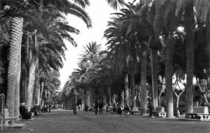 La ciudad es un continuo y permanente escenario de cambios, algunos mejoran sus espacios y siempre delatan el momento histórico en el que se llevaron a cabo. Uno de los elementos que suelen pasar más desapercibidos son los pavimentos, que con sus texturas, materiales y colores determinan los lugares por donde pasamos, por donde nos movemos en la ciudad. He elegido un espacio importante de Melilla, su parque Hernández, para hacer un breve recorrido por las transformaciones de su pavimento. Originalmente era un parque de tierra, como se observa en la lámina (1), fotografía en la que ya aparecen los que fueron bancos de piedra artificial de buena calidad y que permanecieron durante decenios, incluso cuando se realizó un pavimento con lajas de piedra del Gurugú (2).