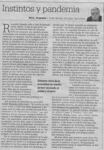 A final de cada día, después de cenar, nos solemos sentar en nuestro sillón de espectador del circo de las pandemias para que infinidad de asesores científicos, políticos curtidos, e ilustres ignorantes en varias disciplinas, nos hablen sobre “nuestros” tres instintos frente al virus: Si sobrevivimos, si nos divertimos o si nos idiotizamos.