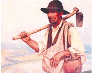 Este pintor Adelardo Covarsí dispone para el fondo del “Jornalero extremeño”, el paisaje que tan acertadamente supo estampar. Tintes amarillentos, rosáceos, parduzcos, azules, violetas, verdes, marrones… Que sabe a jaras, encinas, cantuesos, barbechos, brezo, tomillo, rastrojos y anchas besanas en las que se erguirá el trigo. Porque todo en Covarsí sabe a campo, a caza, trabajo, campesinos, paisaje y paisanaje. Donde faenaron aperadores, labradores, mozos, manaderos, braceros, jornaleros, zagales y rapas, en medio de los surcos, los barbechos y las rastrojeras. Arando, sembrando, cuidando, segando, trillando y almacenando.
