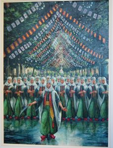 Iniciamos esta descripción con una primera obra realizada en su juventud a finales de la década de 1940. Una obra donde emplea el gouache, las manchas de colores para ilustrar una especie de baile nocturno donde distinguimos a los músicos de la orquesta y a los danzantes y en la que todos ellos lucen vestidos a la moda islámica. No se trata de una obra en sí terminada, si no de un boceto inacabado, en el que podemos observar como nuestro artista experimenta y traza caminos artísticos, que después no seguiría.
