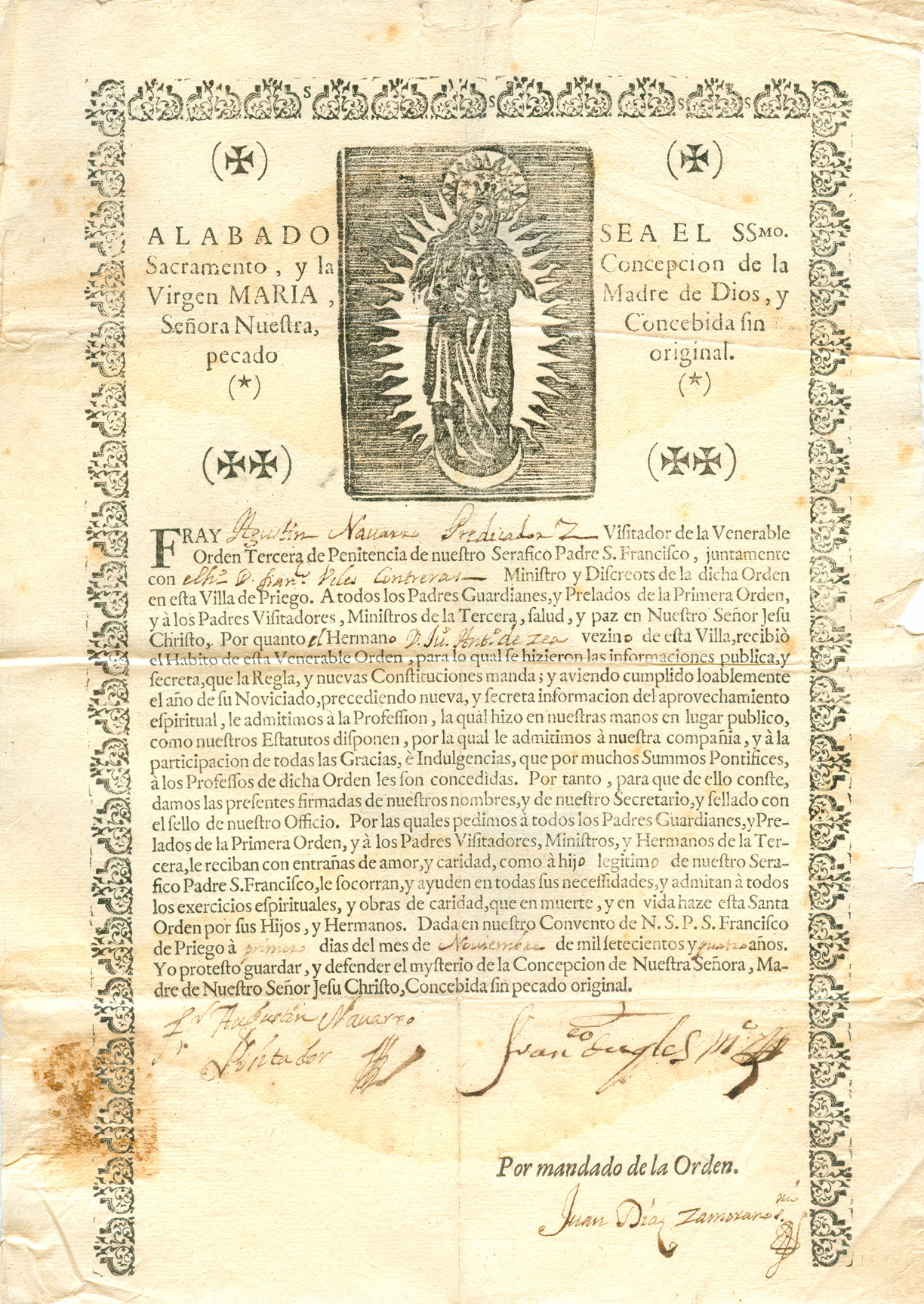En lo que se refiere a laa imprenta conventual la Comisión desamortizadora que dio fe del expolio anotó que también en el convento existía una prensa de mano para imprimir, dos cajas pequeñas de cartón con diferentes casillas y en ellas letras de todas clases y algunos números, más dos hierros para el uso de la impresión y algunos marcos destinados al mismo objeto. Del uso de la imprenta franciscana se ha localizado igualmente una patente de profesión de 1704, signada por el visitador fray Agustín Navarro y el hermano ministro don Francisco Uclés Contreras, y concedida al hermano de la Orden Tercera de Penitencia don Juan Antonio de Zea. Este curioso documento gráfico se encuentra en una colección particular de Montilla (Córdoba). La imprenta debió servir para la edición de algunas novenas y documentos oficiales, particularmente tomas de hábito de las monjas clarisas de las que quedan abundantes testimonios en los protocolos notariales prieguenses. Estamos seguros que de la imprenta conventual franciscana prieguense saldrían también novenas, estampas, avisos y comunicaciones además de las tablas de misas y memorias para general conocimiento.