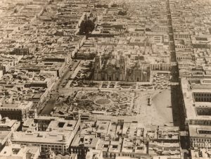 El Zócalo, la Catedral y las calles del Centro en una toma aérea cercana a 1922. A la derecha se ve el Palacio Nacional todavía sin el último piso, además del Mercado del Volador en el espacio que hoy ocupa la Suprema Corte de Justicia. En el fondo destaca la Plaza de Santo Domingo con árboles, y al frente aún no existía la avenida 20 de Noviembre; en su lugar está la Callejuela o Callejón de la Diputación, que separaba el recién inaugurado edificio de El Palacio de Hierro y la antigua sede de Liverpool.