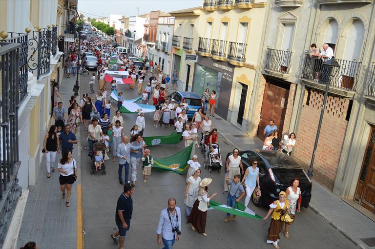 Por la tarde se desarrolló un Desfile Colono con muchos de sus participantes ataviados con trajes coloniales y más de sesenta jóvenes que portaron las banderas de cada uno de los dieciséis pueblos de la colonización. La comitiva estuvo encabezada por la banda de música local y en ella también tuvieron presencia Los Locos de Fuente Carreteros, que posteriormente ejecutaron algunas de sus danzas en la plaza.