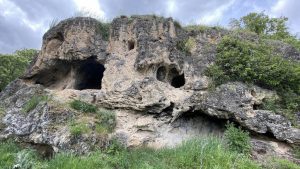 La cueva de “La Covatilla” lleva este nombre desde ha más de mil años. Algunos le llaman también “la peña de la covatilla”, porque realmente se trata de un surgimiento rocoso calizo sobre la margen derecha del valle del Tajuña, que siempre fue muy visible y llamativa, aunque hoy (al menos esta primavera) se oculta entre densas masas arbóreas. En esa roca, destaca la caverna central, de embocadura elíptica, y un interior aplanado con paredes y bóveda cóncavas, muy evidentemente talladas por la mano del hombre. Hay que trepar sobre los salientes para acceder al hueco. La altura de subida es más o menos de metro y medio, lo que confirma (como en otras cuevas se ha visto) que cuando se talló y utilizó, hace más o menos 1.500 años, el acceso era a nivel de campo. La pérdida de terreno en torno a los roquedos se calcula en un milímetro por año, lo que equivale a 10 cms. por siglo.