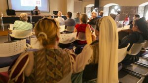 La cronista oficial de la villa, la catedrática Josefa Sanz, introdujo a los miembros de la delegación norteamericana de visita en Avilés en la historia local.