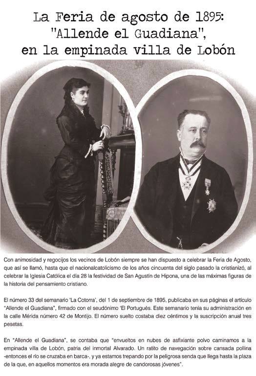 En “Allende el Guadiana”, se contaba que “envueltos en nubes de asfixiante polvo caminamos a la empinada villa de Lobón, patria del inmortal Alvarado. Un ratito de navegación sobre cansada pollina -entonces el río se cruzaba en barca-, y ya estamos trepando por la peligrosa senda que llega hasta la plaza de la que, en aquellos momentos era morada alegre de candorosas jóvenes”. “Celebrabase la feria anual, y allá nos fuimos confiados de encontrar en el alto picacho bandada numerosa de cándidas palomas. Y vaya si la encontramos”.
