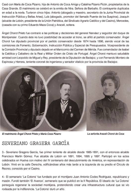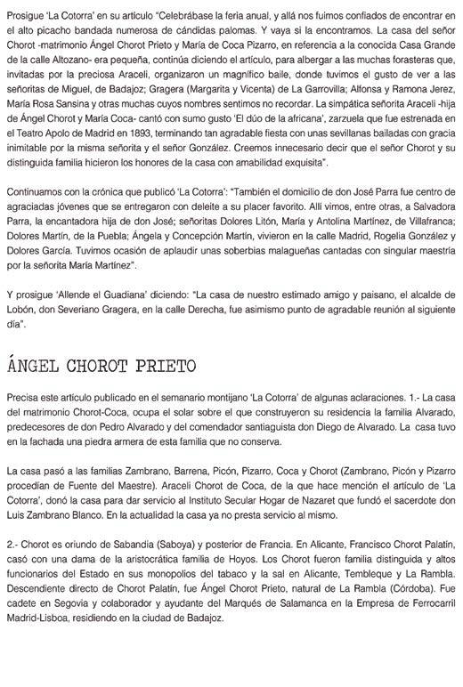 Las fotografías que aparecen en la Revista, cedidas por Cándido Chorot, son: el matrimonio Ángel Chorot Prieto-María Coca Pizarro, y la señorita Araceli Chorot de Coca que cantó con sumo gusto ‘El dúo de la africana’, zarzuela que fue estrenada en el Teatro Apolo de Madrid en 1893, terminando tan agradable fiesta con unas sevillanas bailadas con gracia inimitable por la misma señorita y el señor González.