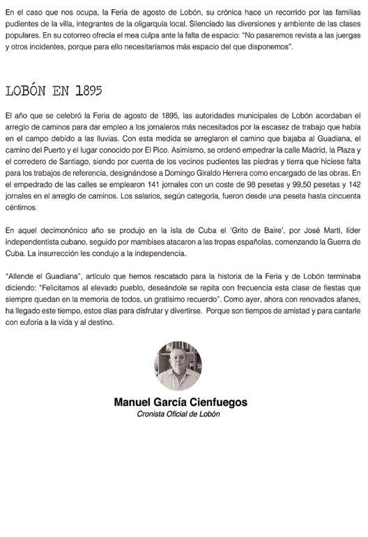 “Allende el Guadiana”, artículo que hemos rescatado para la historia de la Feria y de Lobón terminaba diciendo: “Felicitamos al elevado pueblo, deseándole se repita con frecuencia esta clase de fiestas que siempre quedan en la memoria de todos, un gratísimo recuerdo”. Como ayer, ahora con renovados afanes, ha llegado este tiempo, estos días para disfrutar y divertirse. Porque son tiempos de amistad y para cantarle con euforia a la vida y al destino.