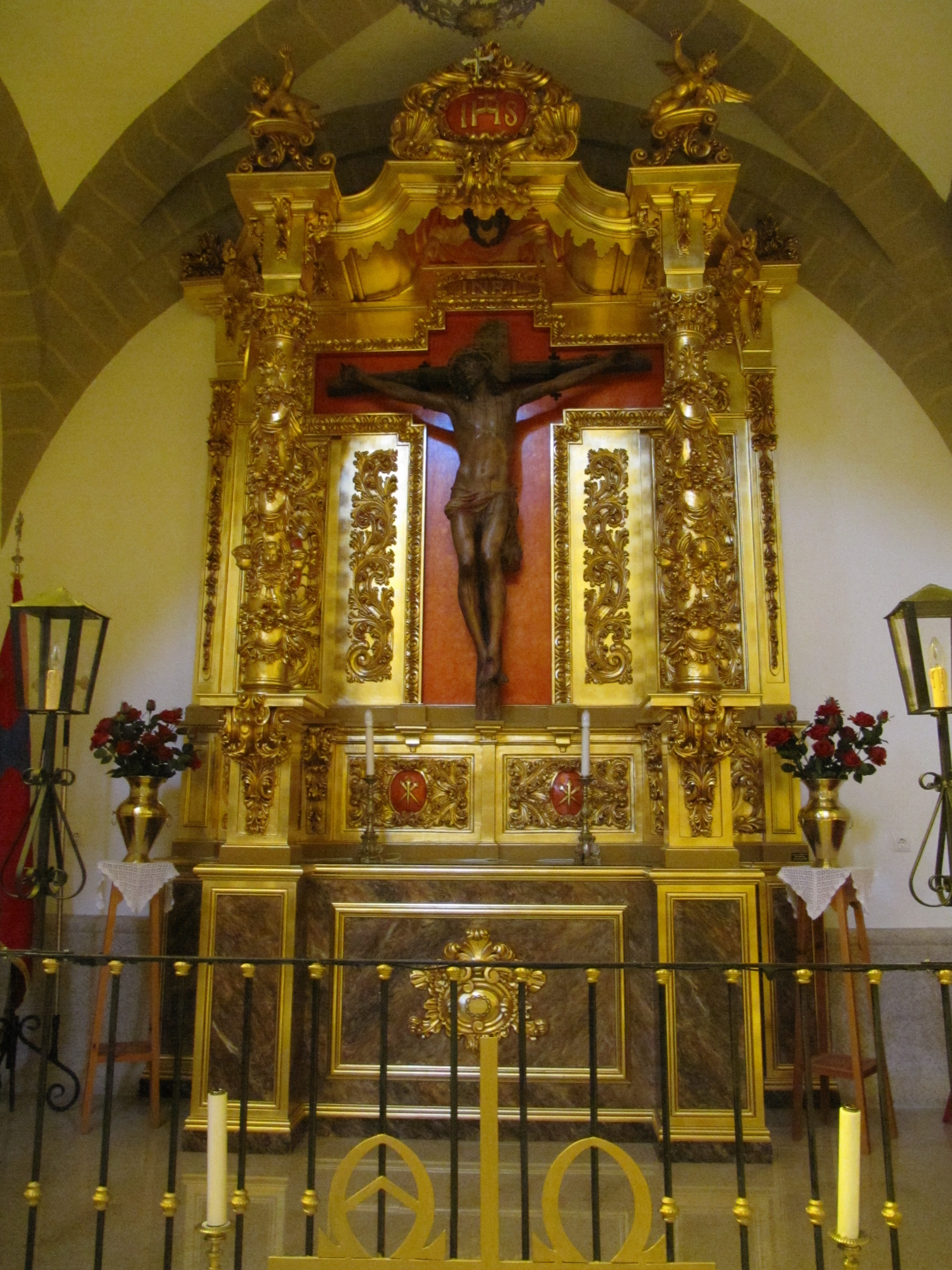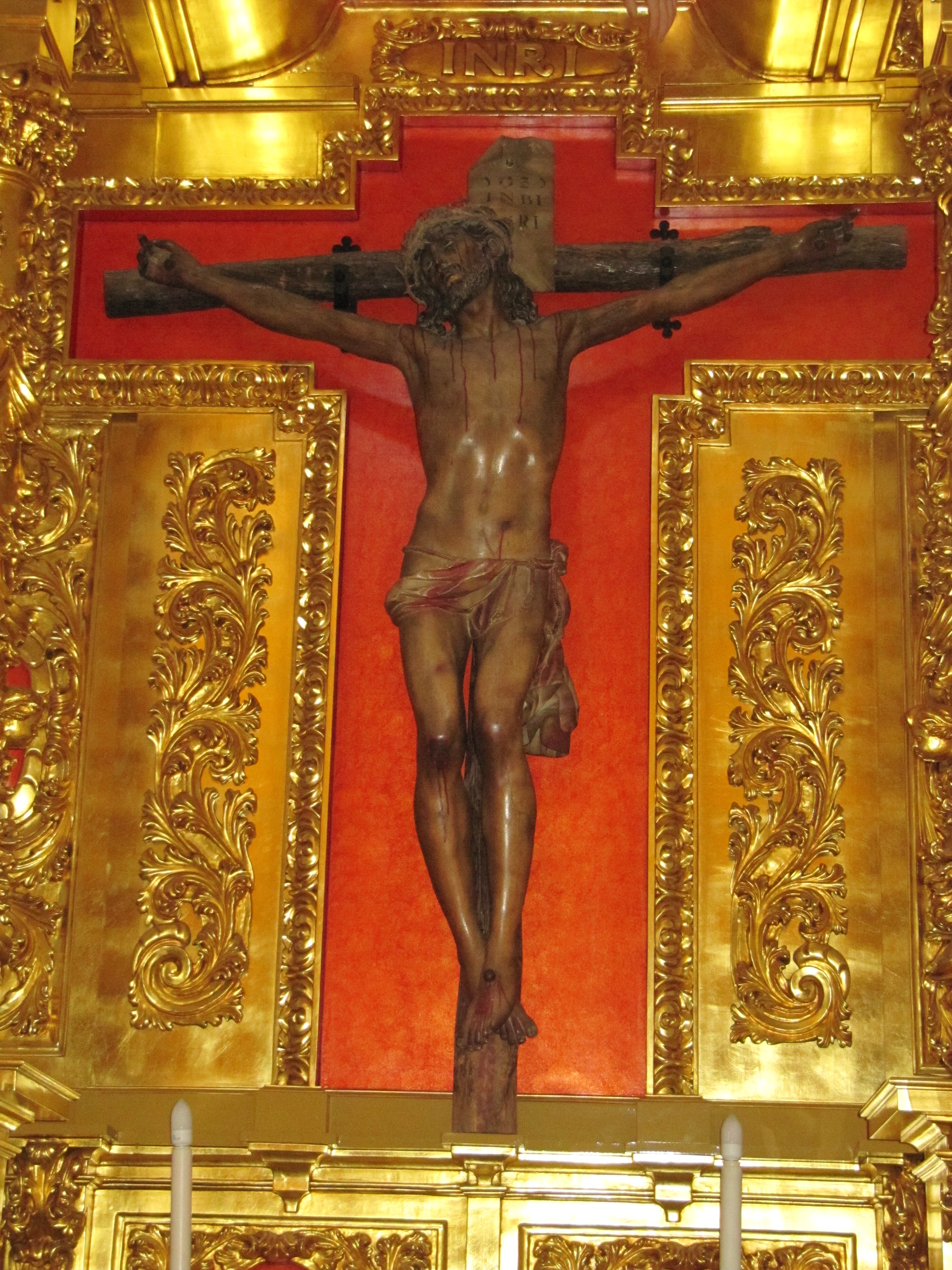 En el Altar mayor se conserva una talla de Jesús crucificado, en madera policromada. Estamos ante una talla de Cristo en cruz de gajos, con una anatomía de formas suaves y redondeadas, presentando un rostro sereno dentro de la corriente naturalista de influencia francesa. Tiene los brazos extendidos, casi en la horizontal, con las manos abiertas. Presenta un tórax algo señalado, así como las costillas, pero de marcadas formas redondeadas, lo que se llama un modelado blando. La cabeza está algo inclinada hacia el hombro derecho. El cabello se dispone en mechones que caen sobre los hombros, pegados a la cabeza a modo de casquete, y barba corta y rizada, con la boca entreabierta y los ojos abiertos.