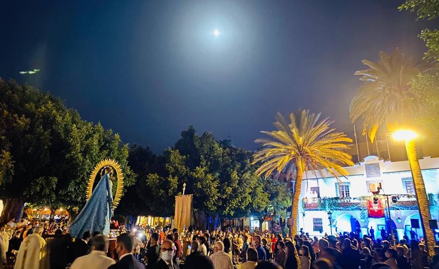 Vítores y aplausos interrumpieron la serena noche en la que la Plaza de España se puso de pie para ver el corto recorrido que la Virgen dio este año, con un pueblo que se emociona a su paso cada vez que las campanas de la Iglesia Matriz anuncian su salida.