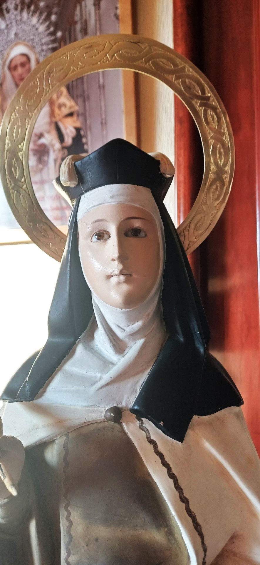 Santa Teresa, fue canonizada en el año 1622 por el Papa Gregorio XV, Pablo VI en el año 1970 la declaro Doctora de la Iglesia, es la santa española más universal. Su mencionada imagen en la actualidad se encuentra ubicada en el local social de las Amas de Casa de la que es su patrona.