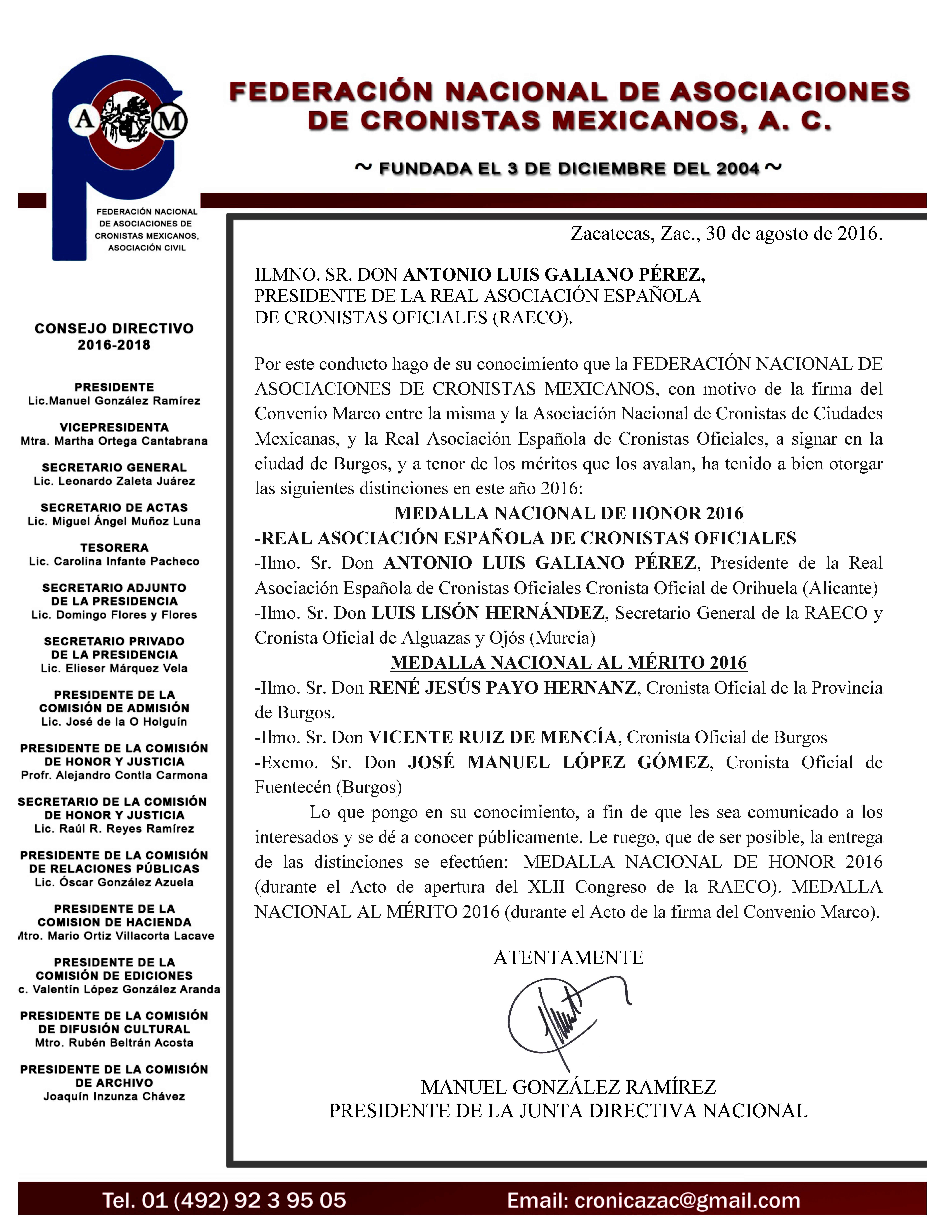 La FEDERACIÓN NACIONAL DE ASOCIACIONES DE CRONISTAS MEXICANOS S C, con motivo de la firma del Convenio Marco entre la misma y la Real Asociación Española de Cronistas Oficiales, a firmar en la ciudad de Burgos, y a tenor de los méritos que los avalan, ha tenido a bien otorgar las siguientes distinciones en este año 2016: