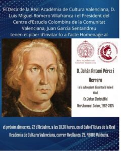 «El Decà de la Real Acadèmia de Cultura Valenciana, D. Luis Miguel Romero Villafranca i el President del Centre d’Estudis Colombins de la Comunitat Valenciana, Juan García Sentandreu tenen el plaer d’invitar a l’acte Homenage  a D. Johàn Antoni Pérez i Herrero i a la subsegüent dissertació bain el título “En Johan Christòfol Berthomeu i Colom, 1492-2025”».